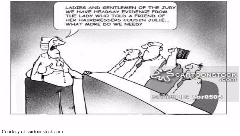 - Hearsay— Information heard by one person about another. Hearsay is generally inadmissible as evidence in a court of law because it is based on the reports of others rather than on the personal knowledge of a witness. Hearsay is an out of court statement, any statement—written or oral, offered for the truth of what is written or said. And this is critical to DUI cases because prescreening tests are usually printed out, and the print out of the results is a “ writing.” And according to evidence rules, “ the content of a writing may be proved by an otherwise admissible original.” This means that the prosecution would have the officer testify to breath test results without offering the original statement (print out) of said results.